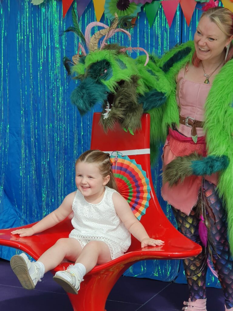 Meet Thunder. He’s our oversized, friendly, furry, fantastical & far from fierce green dragon puppet who loves to play games & make new friends.